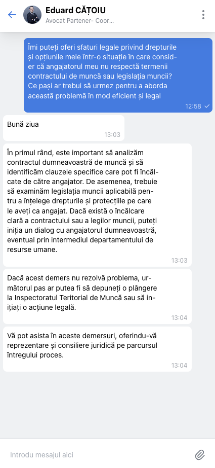 Îți punem la dispoziție avocați experimentați din diverse arii juridice, 24/7, cu ajutorul tehnologiei CHAT, pe care o poți accesa pe telefonul tău mobil sau calculator.